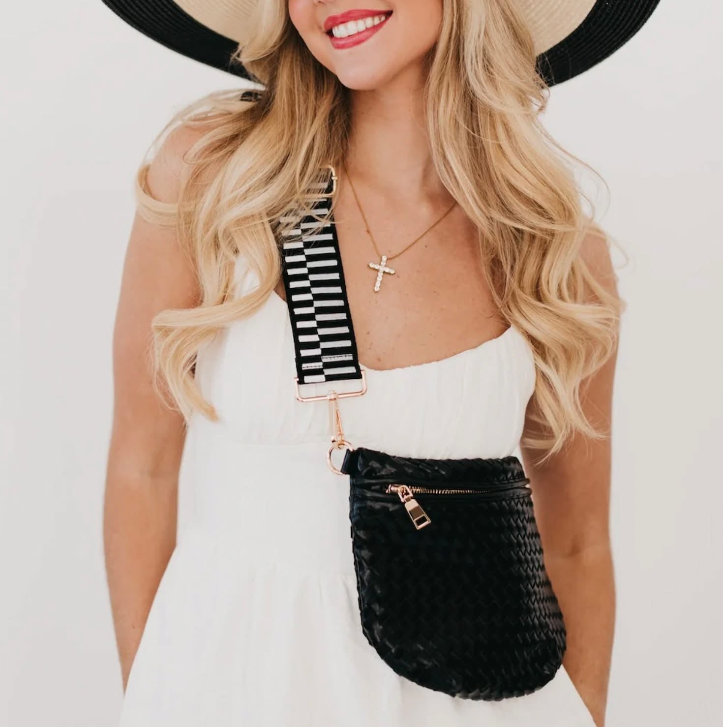 Meet the Westlyn Woven Bum Bag! Gorgeous woven vegan leather available in solid colors with a unique block design on the strap gives us edgy, rocker vibes. Beautiful hardware with a zipper closure with beige and black chevron interior, and a zippered slash pocket on the inside. This crossbody bag is the perfect accessory to elevate any outfit!
